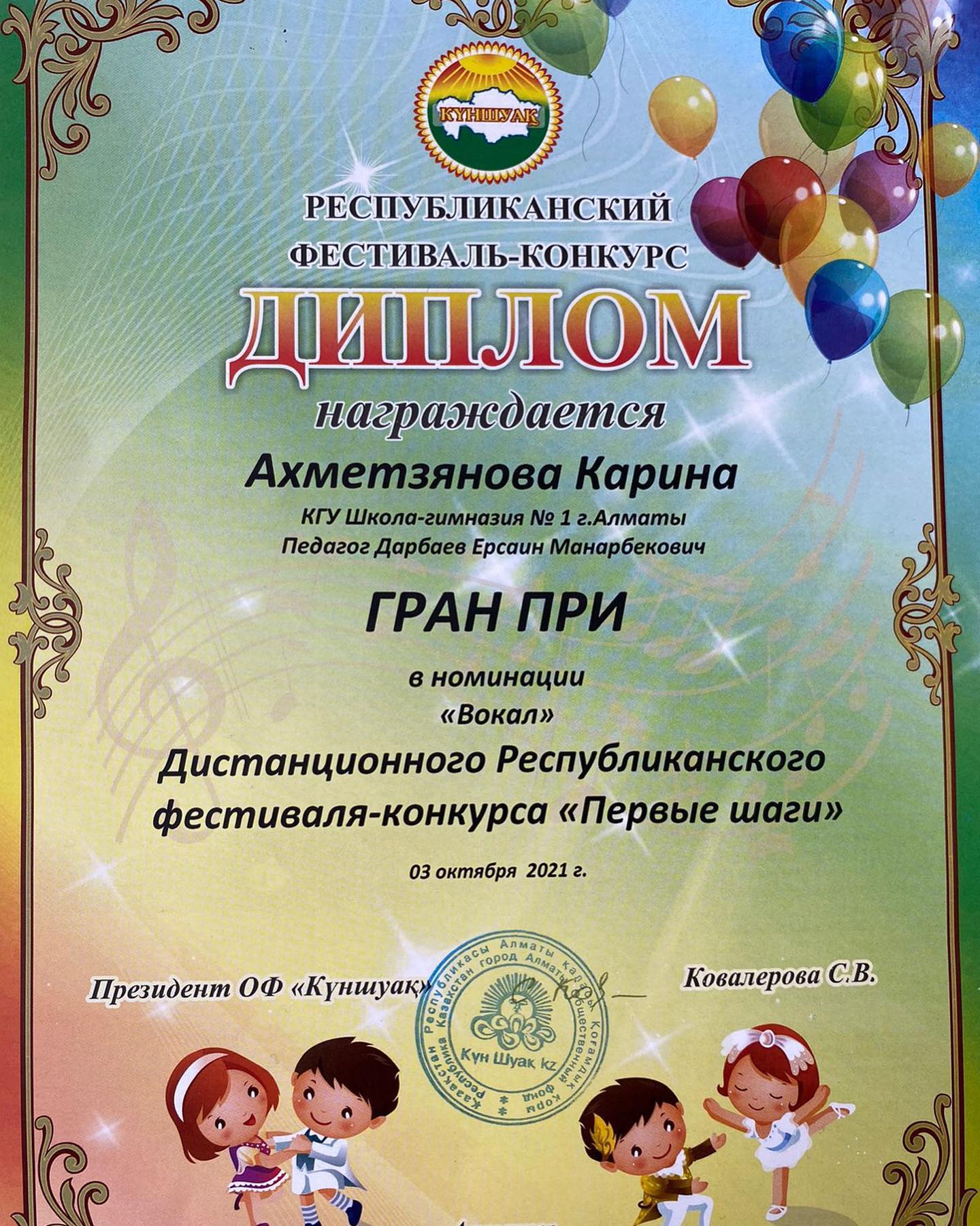 06 қазан 2021 0 1 2 3 4 5 Достижение нашей ученицы 9 «В» класса , Ахметзяновой Карины, поздравляем!!!🥳🥳🥳🤍🤍 Учащаяся 9 «В» класса, Ахметзянова Карина была награждена в Республиканском Фестиваль- Конкурсе в номинации «Вокал» получила Гран При! Поздравляем 👏🏼👏🏼👏🏼 Осы беттің QR-коды:QR-код этой страницы: