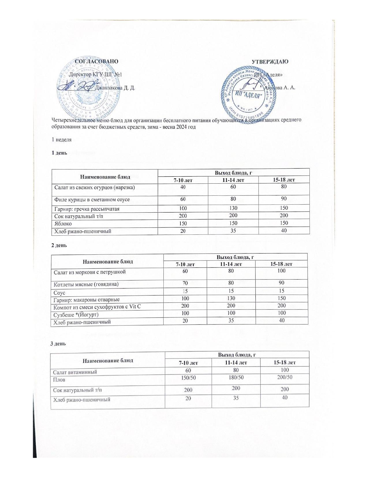 МЕНЮ ЗИМА-ВЕСНА 1 НЕДЕЛЯ