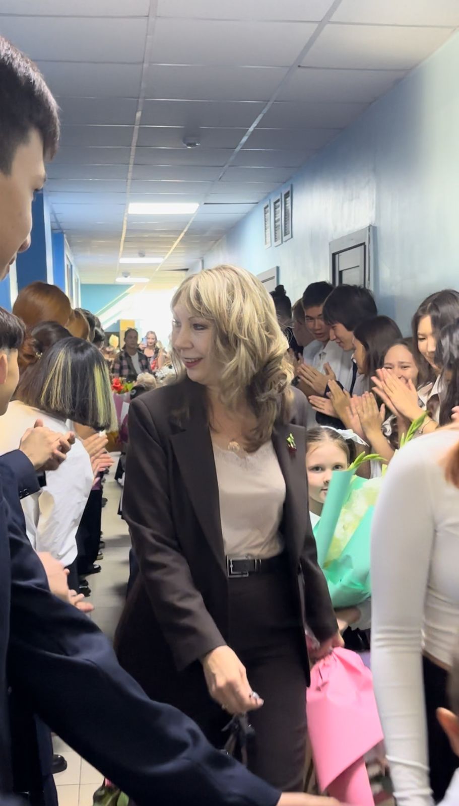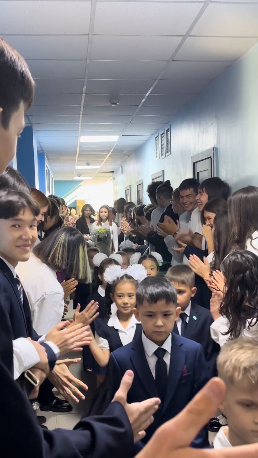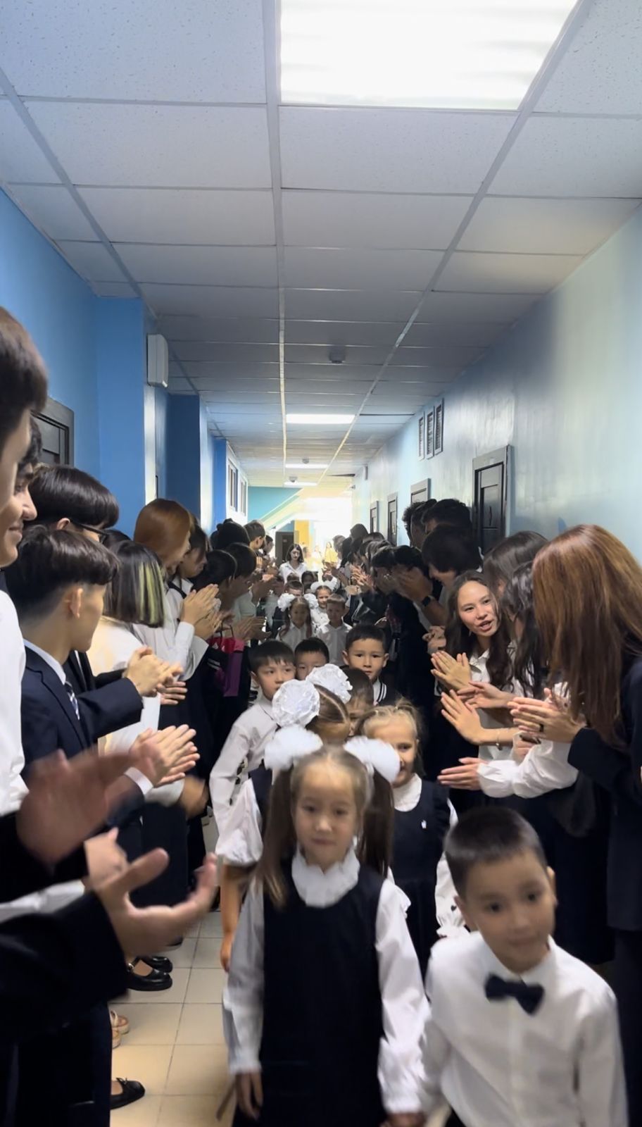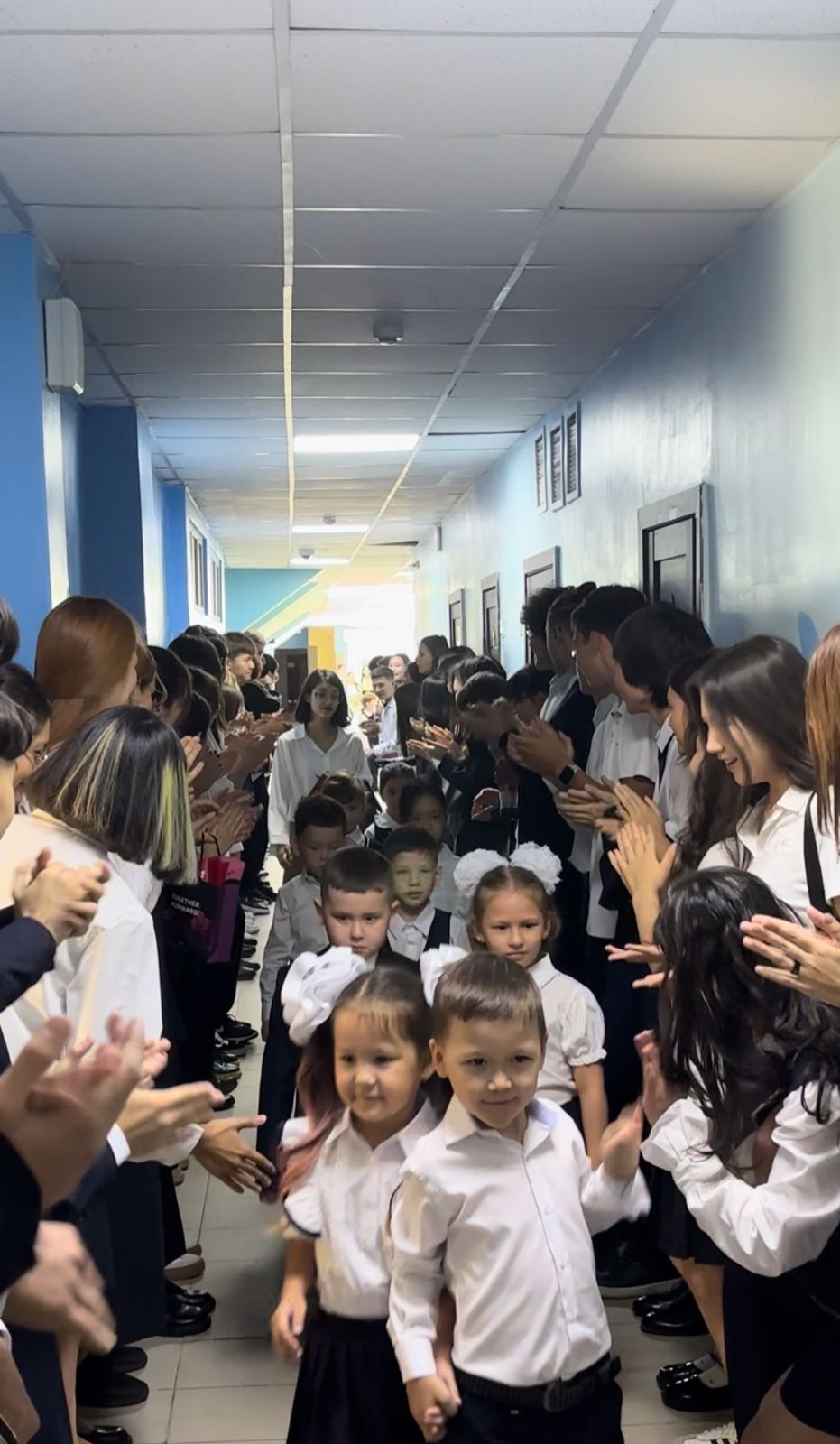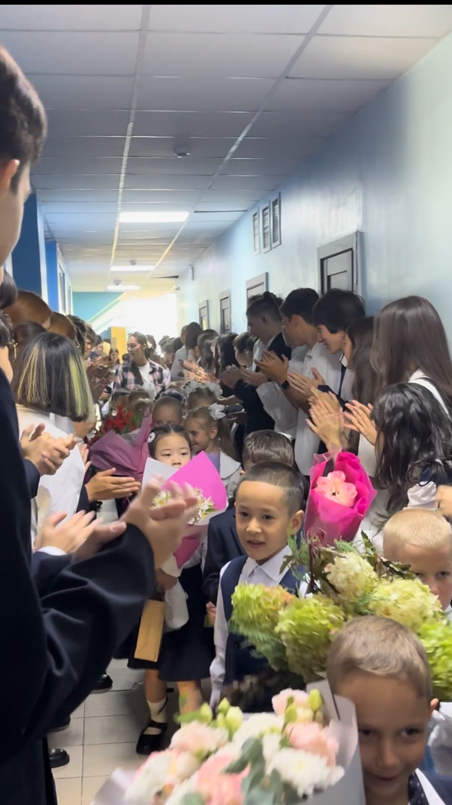 Бүгін №1 мектеп-гимназиясында өткен салтанатты жиында жақсы дәстүр – «тірі дәліз» ұйымдастырылды./Сегодня на торжественной линейке в школе-гимназии №1 прошла добрая традиция – «живой коридор».